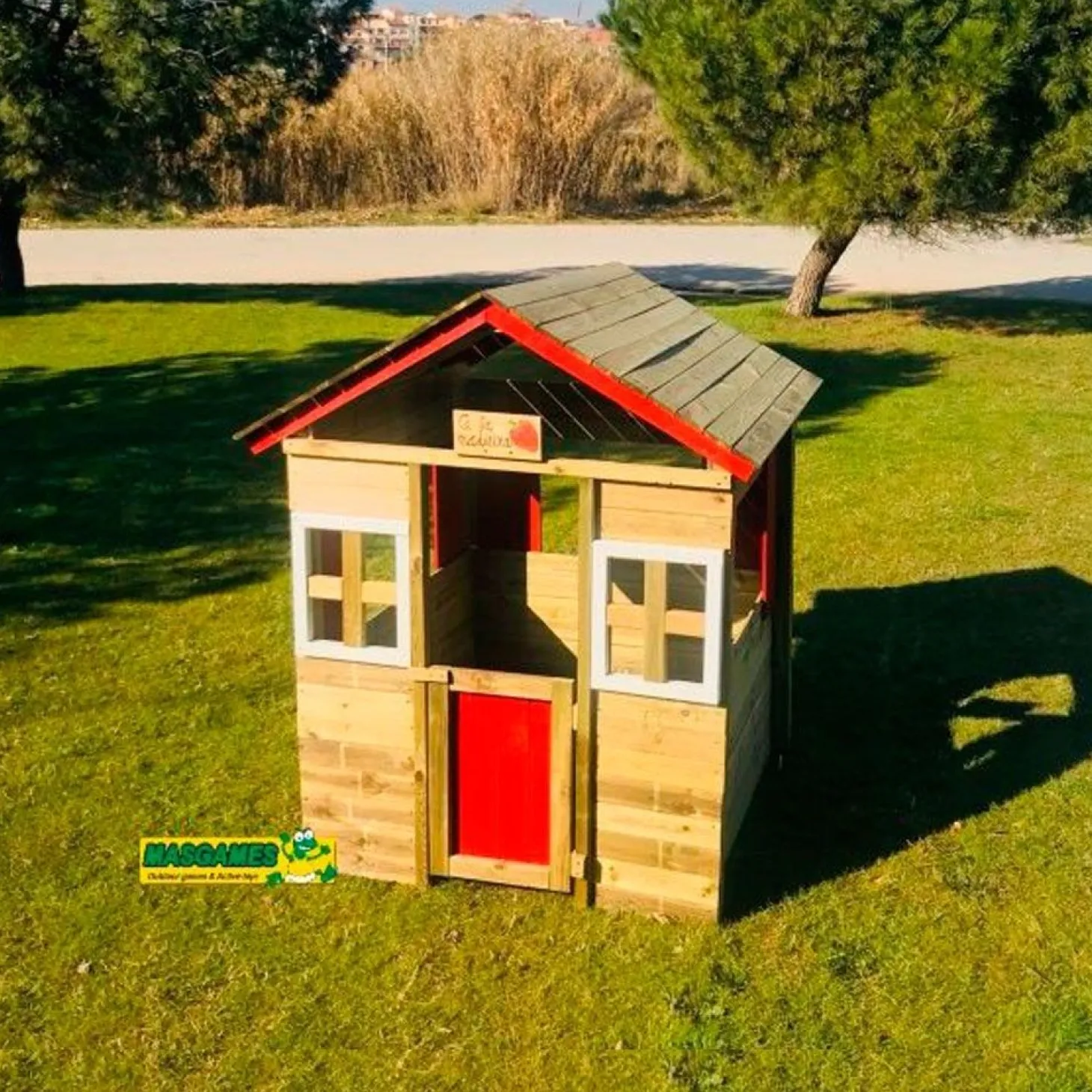 Casita para juegos, modelo Fresita XL. Fabricada en madera con tratamiento para el exterior. Techo a dos aguas y amplio frontón abierto. Casita de grandes dimensiones, perfecta para el disfrute de los niños en el patio o jardín de casa.