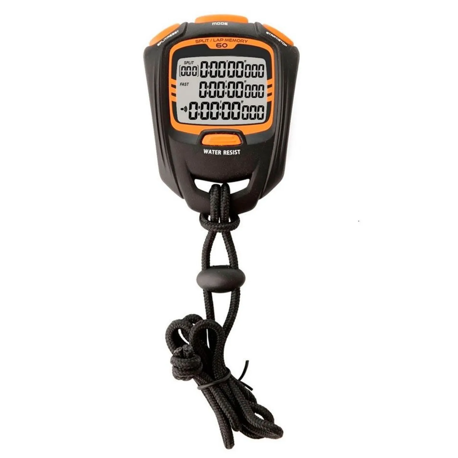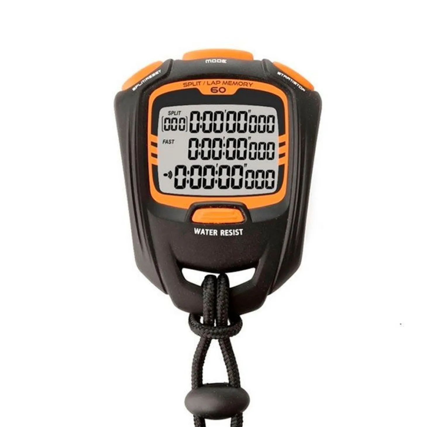 Cronómetro deportivo profesional con 60 memorias y pantalla con tres líneas para disponer de toda la información en una rápida lectura. Resistente al agua.