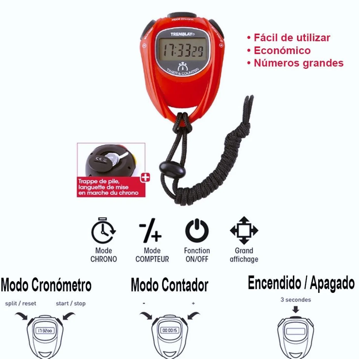 Cronómetro profesional básico con precisión 1/100, funciones de crono y contador manual, función de ahorro de batería y de silencio.