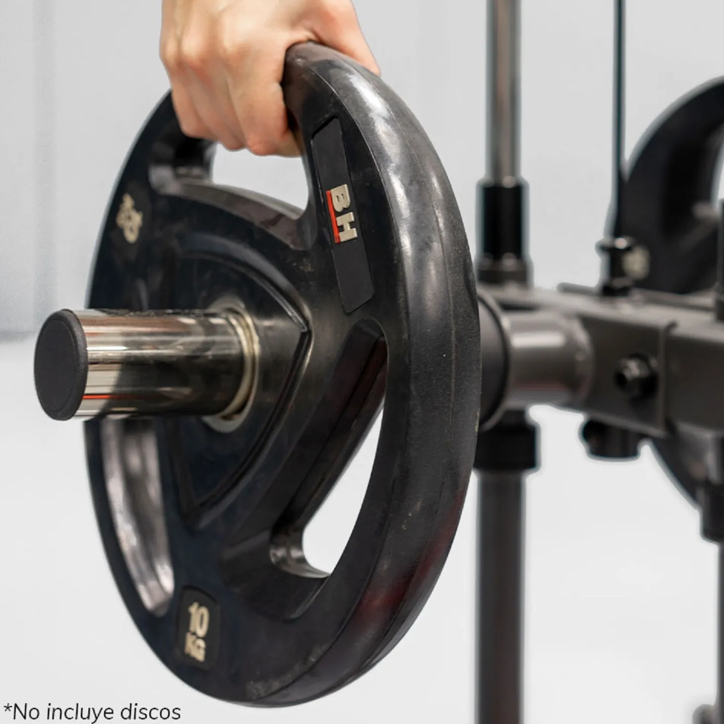 - Clavijas de banda de resistencia: Permiten agregar gomas elásticas a los entrenamientos con barra. Esto asegura una tensión constante en el movimiento, dando un impulso extra para potenciar los levantamientos