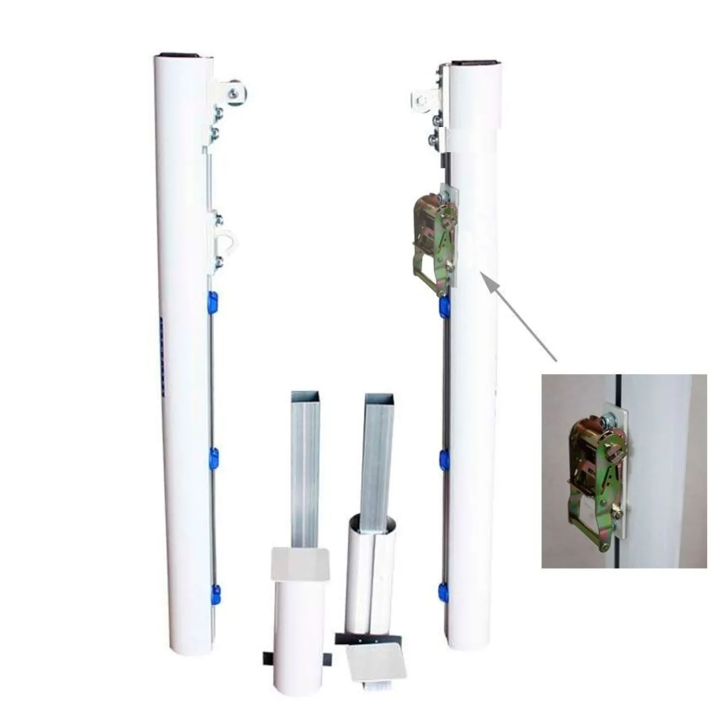 Nuevos y prácticos postes de tenis fabricados en tubo de aluminio nervado de 2mm en sección redonda de Ø80mm, diseñados para anclar en el suelo mediante botes metálicos (INCLUYE BOTES) empotrados en zapata de hormigón. Incluye carraca tensora para poder tensar el cable de la red que se quiera colocar, así como para evitar impactos.