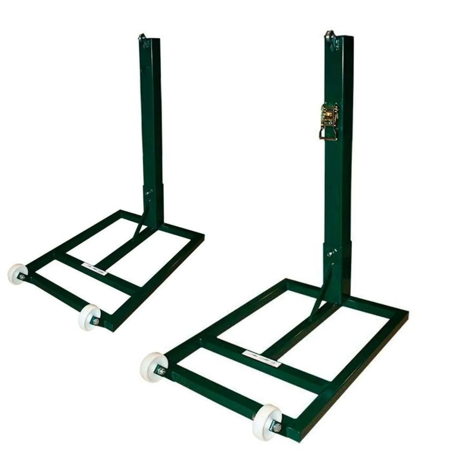 Nuevos y prácticos postes de tenis trasladables para montar y desmontar la pista de tenis fácilmente. Han sido fabricado en acero de 2mm en sección cuadrada de 80x80mm, unido a una base metálica trasladable de 80x60cm con 2 ruedas. Esta base permite la colocación en su parte posterior de un cajón de contrapeso para evitar el vuelco.