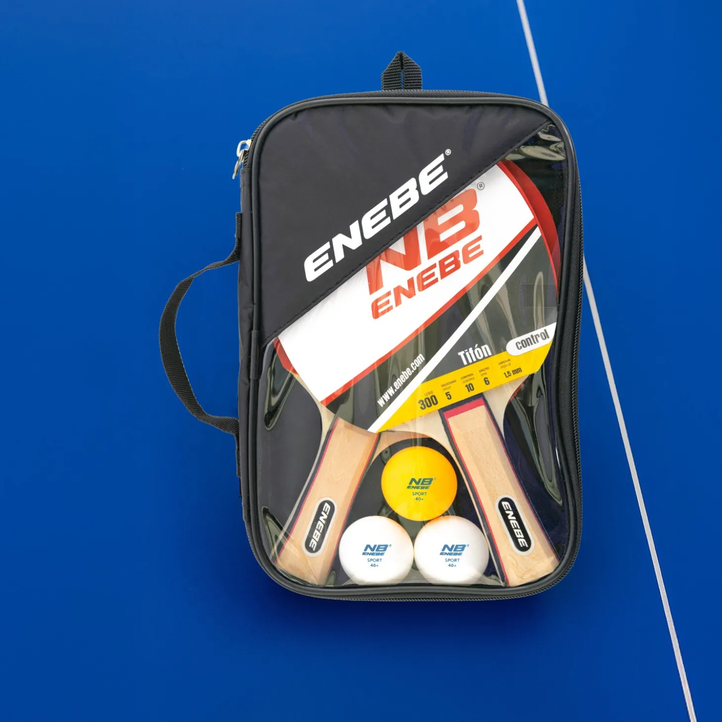 Juego completo de ping pong de Enebe con dos palas Enebe Tifon. Todo en una práctica funda con asa para llevarlo y guardarlo cómodamente.