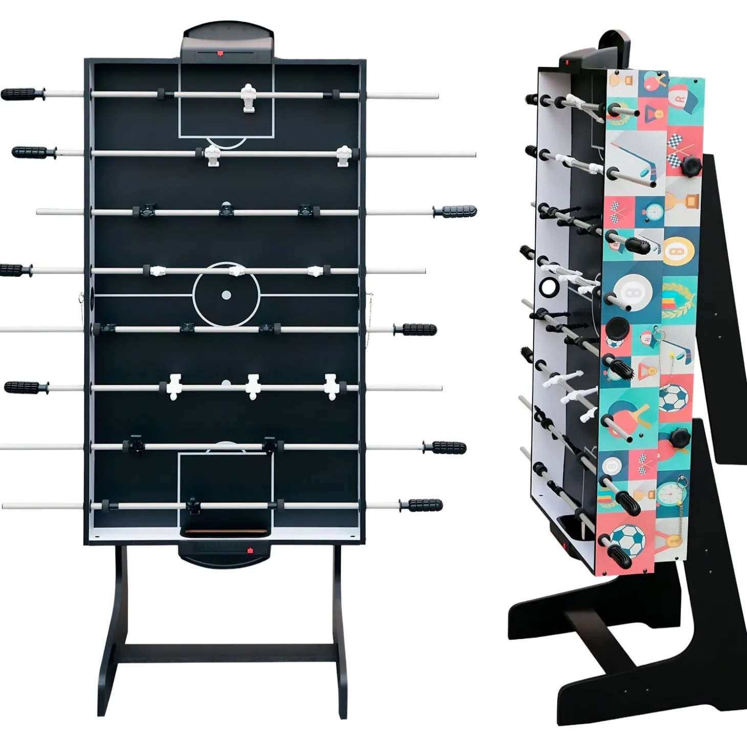 Con unas medidas de 124x61x79cm, esta mesa combina el tamaño ideal para el hogar con una gran versatilidad. Basta con rotar o cambiar los tableros para pasar de un juego a otro en segundos. Desde emocionantes partidas de futbolín hasta partidas de billar o tenis de mesa, pasando por el dinámico air hockey, todo está incluido para disfrutar sin interrupciones. El sistema plegable permite guardarla fácilmente cuando no se usa, ocupando muy poco espacio. Perfecta para casas con niños, está fabricada con materiales resistentes y bordes redondeados para mayor seguridad. Además, su diseño compacto facilita que los más pequeños jueguen cómodamente sin riesgos.