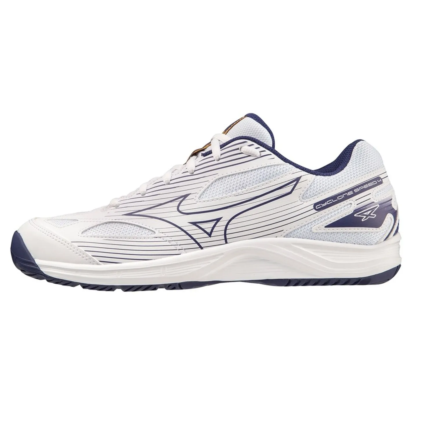 Mizuno presenta las zapatillas de voleibol Cyclone Speed 4 en color blanco y azul marino. Estas zapatillas son ideales para potenciar tu rendimiento en la pista.