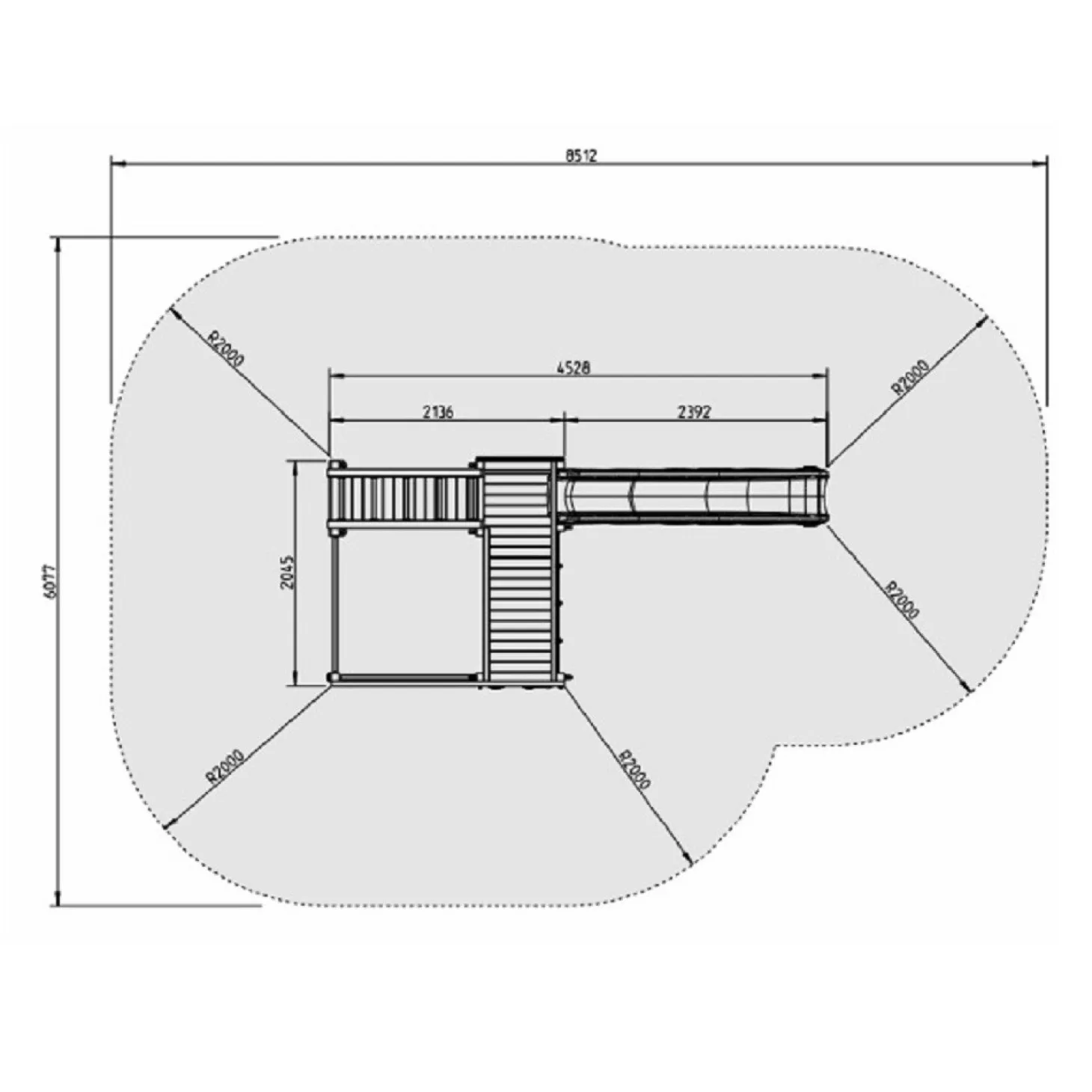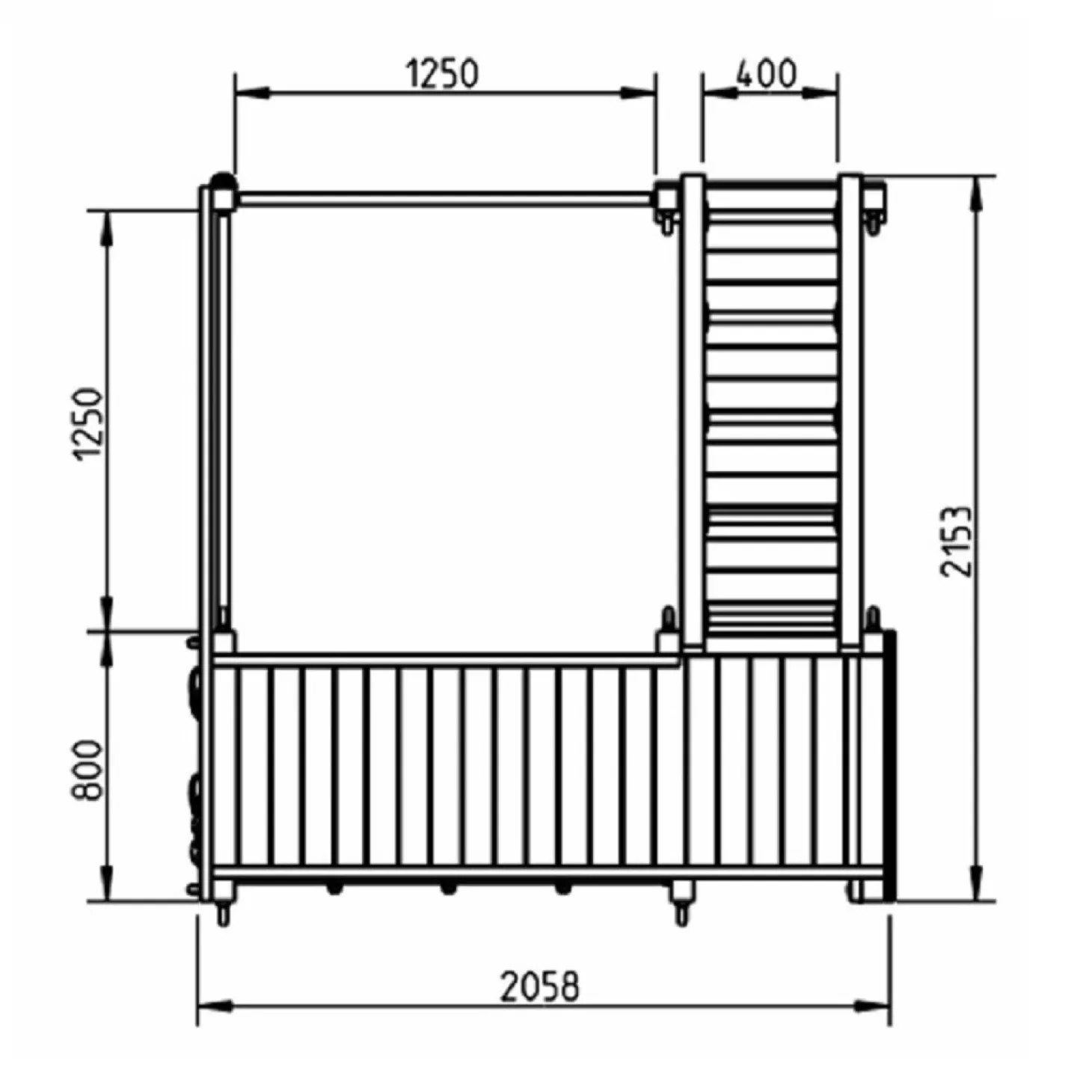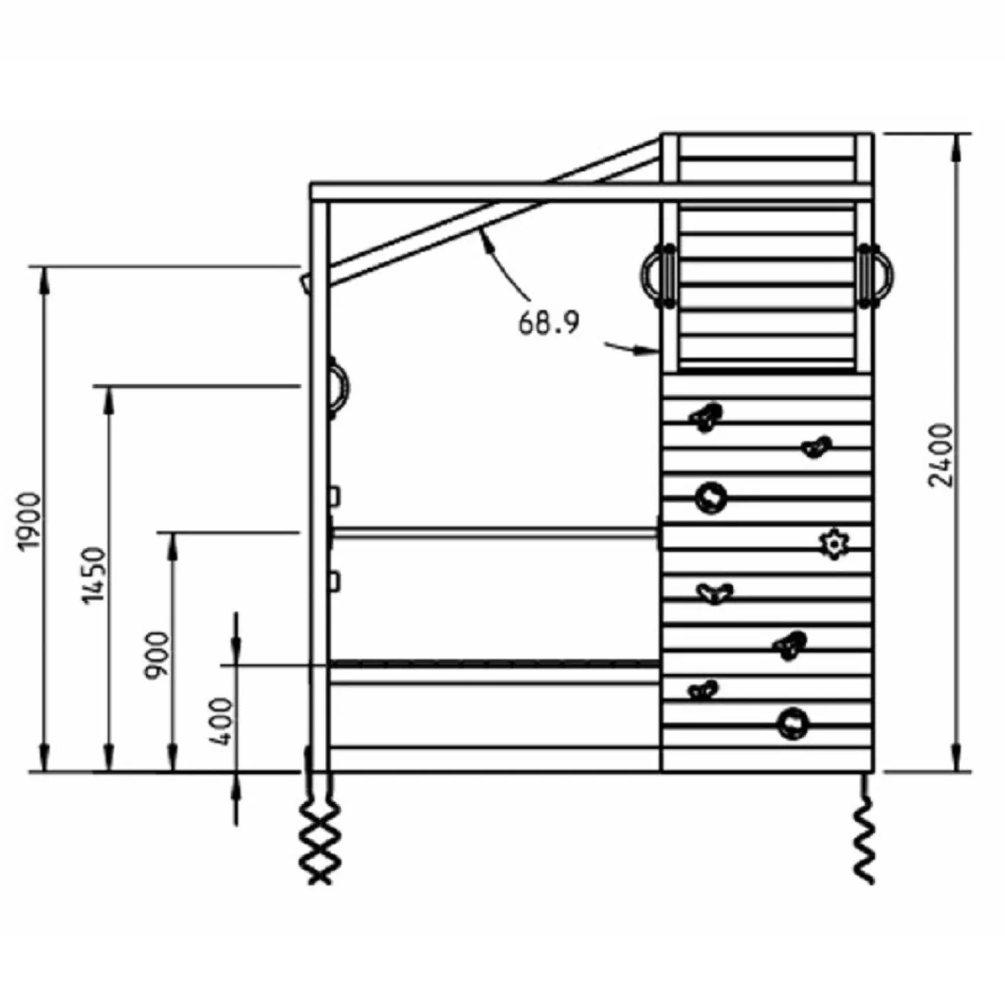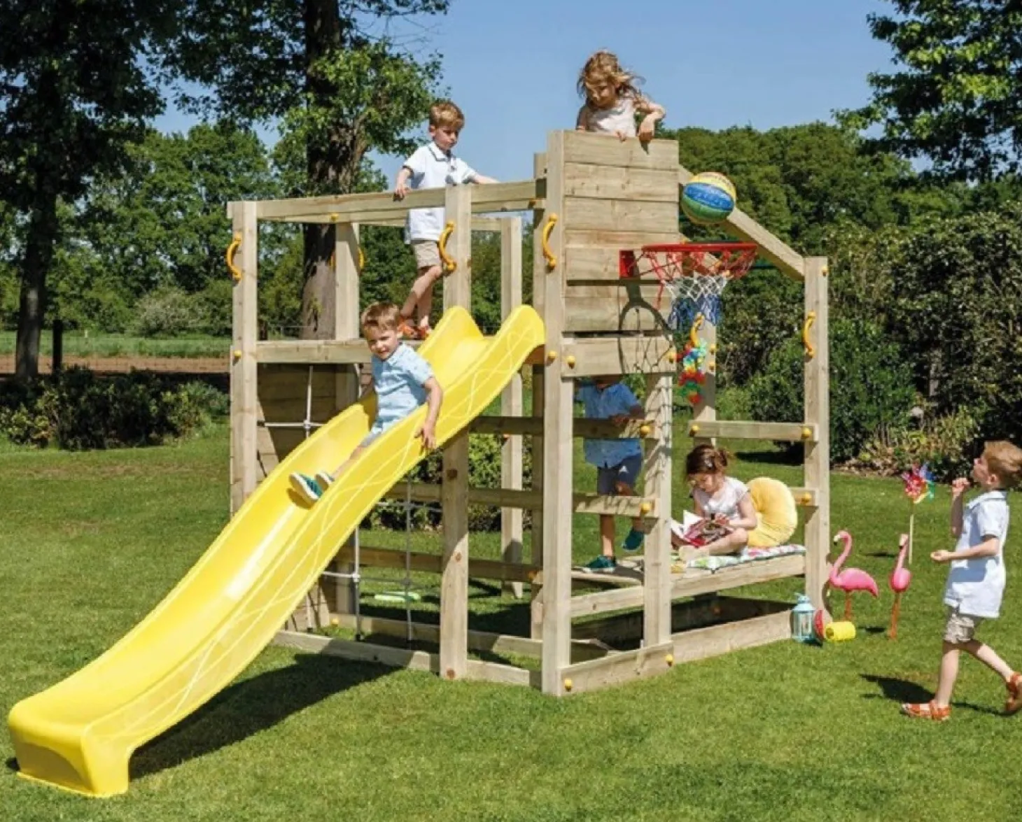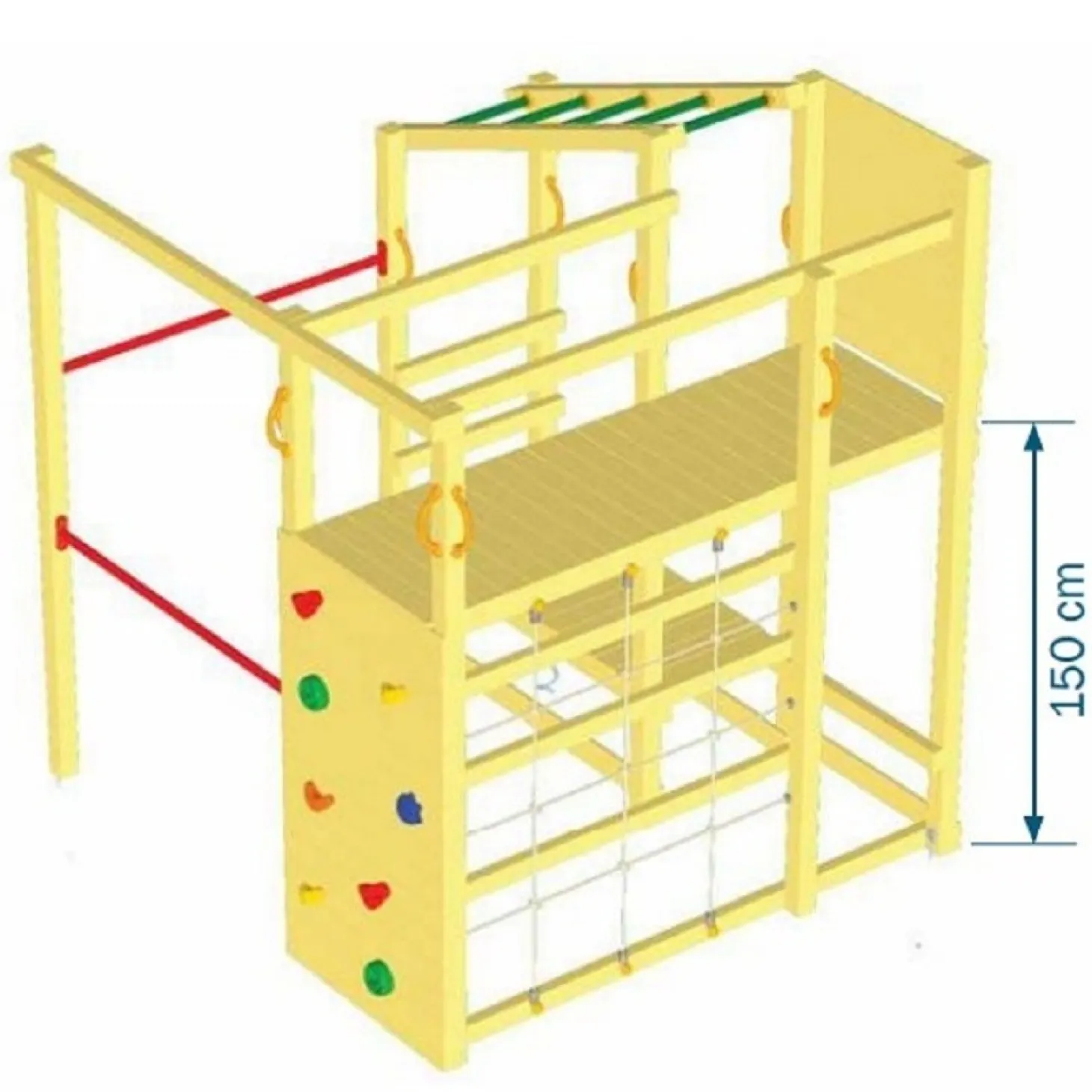Esta torre multijuegos ofrece muchas actividades con las que los niños se divertirán durante horas. Tiene una pared de cuerda para trepar, dos barras fijas, un puente de mono, una pared de escalada, una escalera fija de madera y una pasarela de madera que sirve a su vez de banco. Este parque infantil tiene unas medidas de 458x204x240cm (largo x ancho x alto), y la altura de la plataforma del tobogán es 1’50m, siendo la propia rampa del tobogán de 3m de largo. Este parque ha sido fabricado con materiales de gran resistencia y calidad, siendo de madera tratada de pino, resistente a las inclemencias del tiempo. Se recomienda dejar dos metros alrededor de zona de seguridad para evitar accidentes indeseados. No incluye la canasta de básquet ni los accesorios móviles que pueden verse en las fotografías.