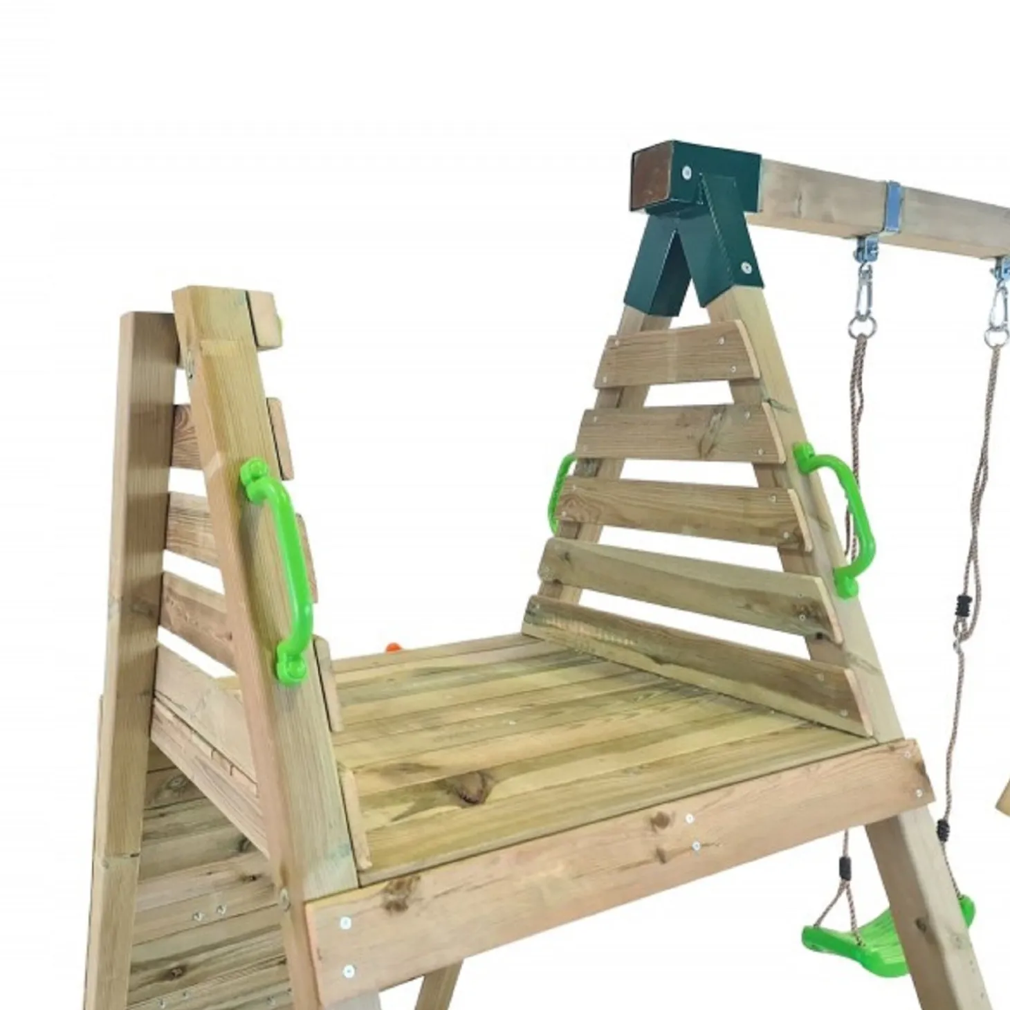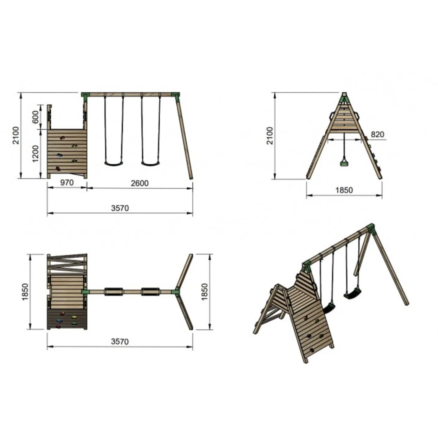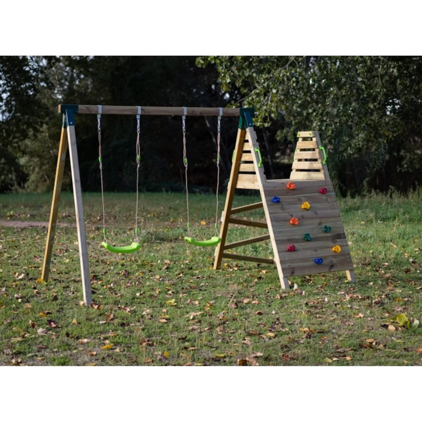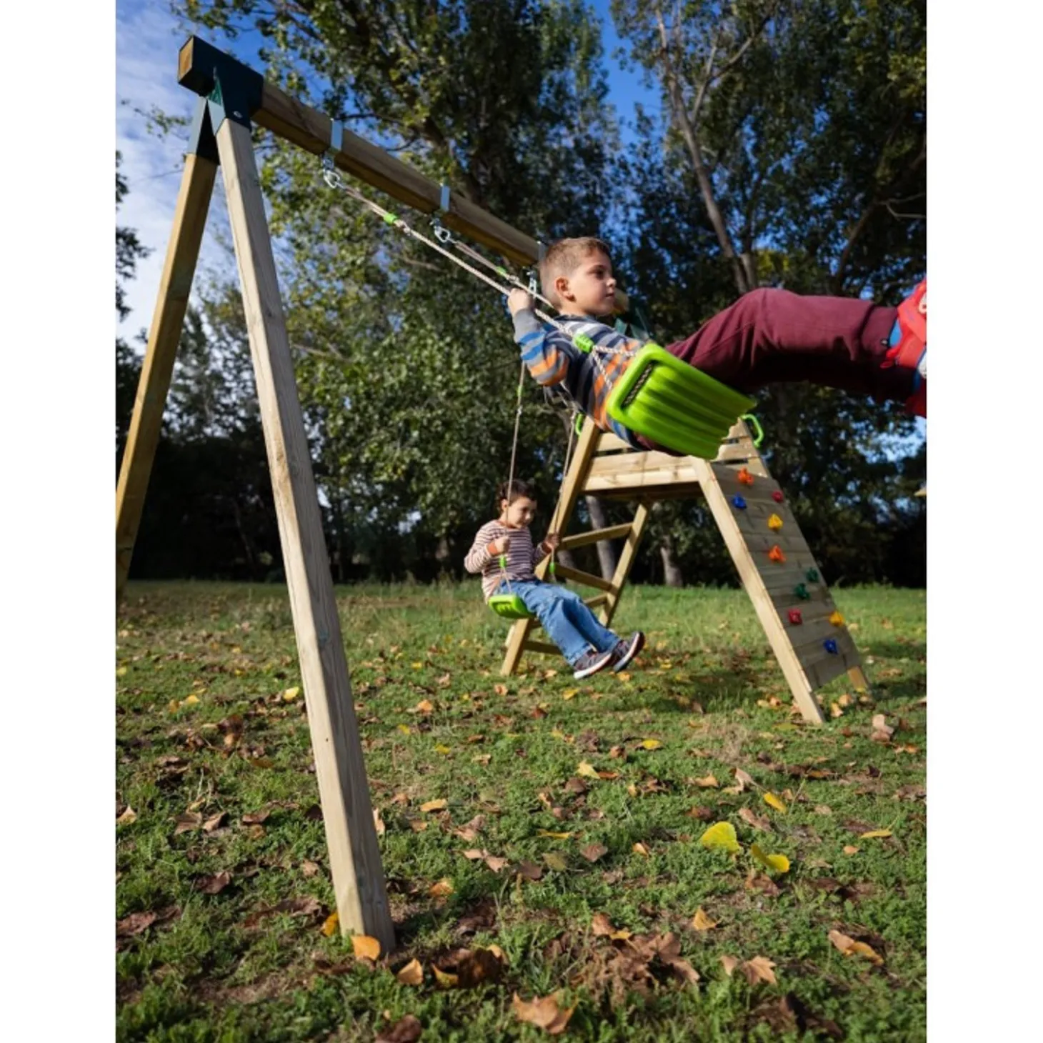 Con una estructura robusta de madera tratada para resistir la intemperie, este parque ofrece múltiples opciones de entretenimiento, convirtiendo el jardín en un auténtico espacio de aventura. Cuenta con una amplia torre de juegos con plataforma elevada, desde donde los niños podrán deslizarse por un divertido tobogán. Además, incorpora una escalera de fácil acceso y una pared de escalada, fomentando el desarrollo de la coordinación y la motricidad. Para completar la experiencia, el parque incluye dos columpios, añadiendo más posibilidades de diversión. Su estructura estable, bordes redondeados y materiales de alta calidad minimizan los riesgos durante el juego. Además, cumple con las normativas de seguridad europeas, garantizando la tranquilidad de los padres mientras sus hijos juegan sin preocupaciones. Este parque infantil es perfecto para fomentar la actividad física, la creatividad y el juego en grupo, permitiendo que los niños desarrollen habilidades mientras se divierten.