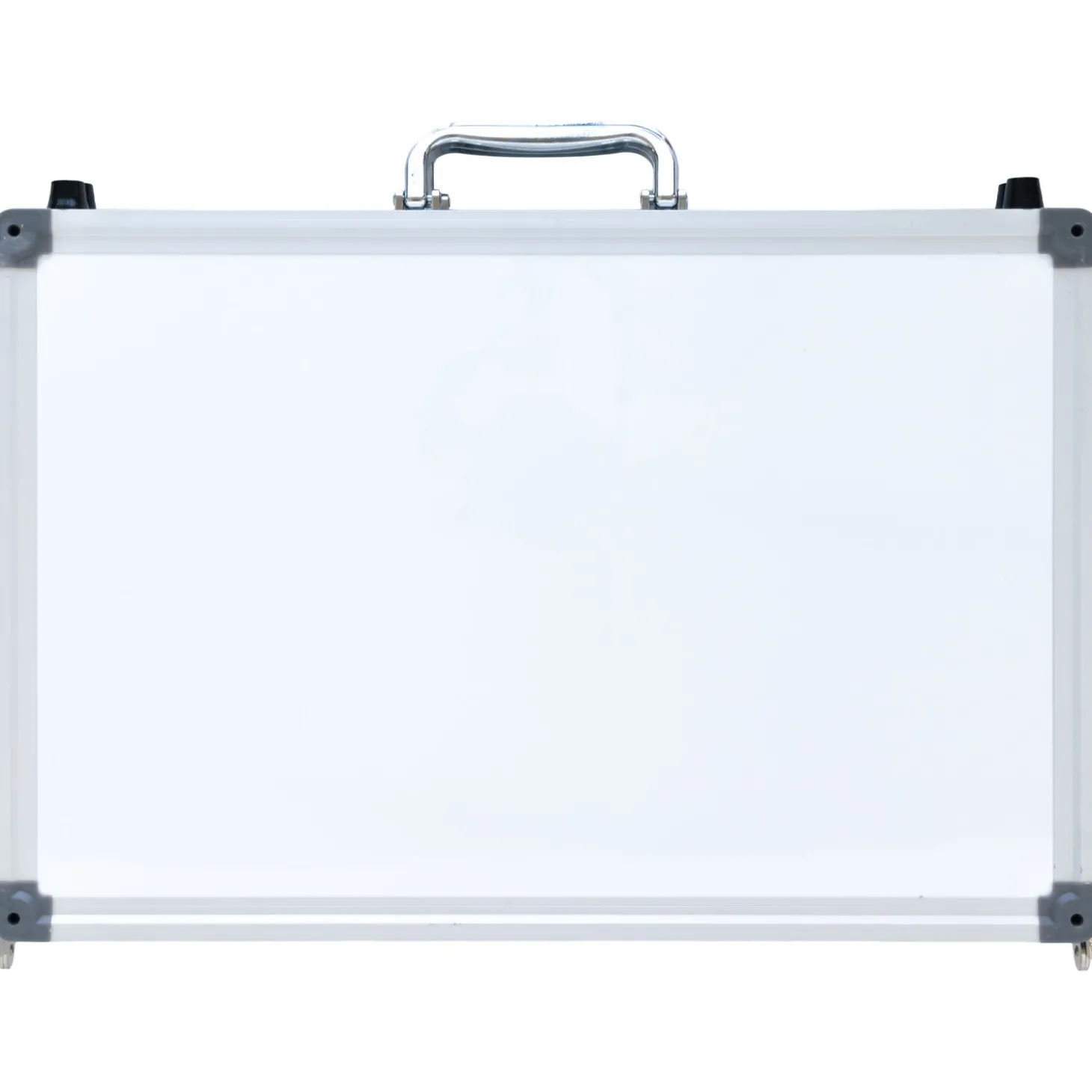 Esta pizarra magnética plegable esta especialmente indicada para todos aquellos que necesitan una pizarra de grandes dimensiones y desean transportarla con facilidad. Medida abierta 45×60 cm. Cerrada 30×45 cm.