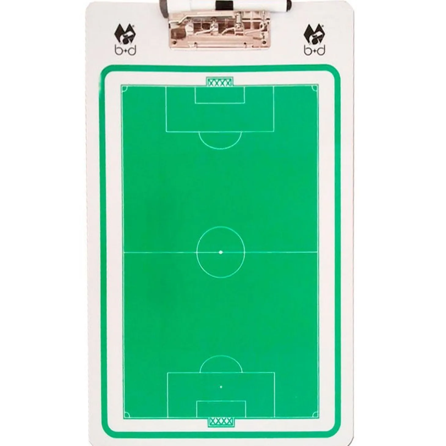 Pizarra tácticas con impresión del campo en ambas caras. Porta bloc con clip de sujeción y rotulador tipo Velleda.