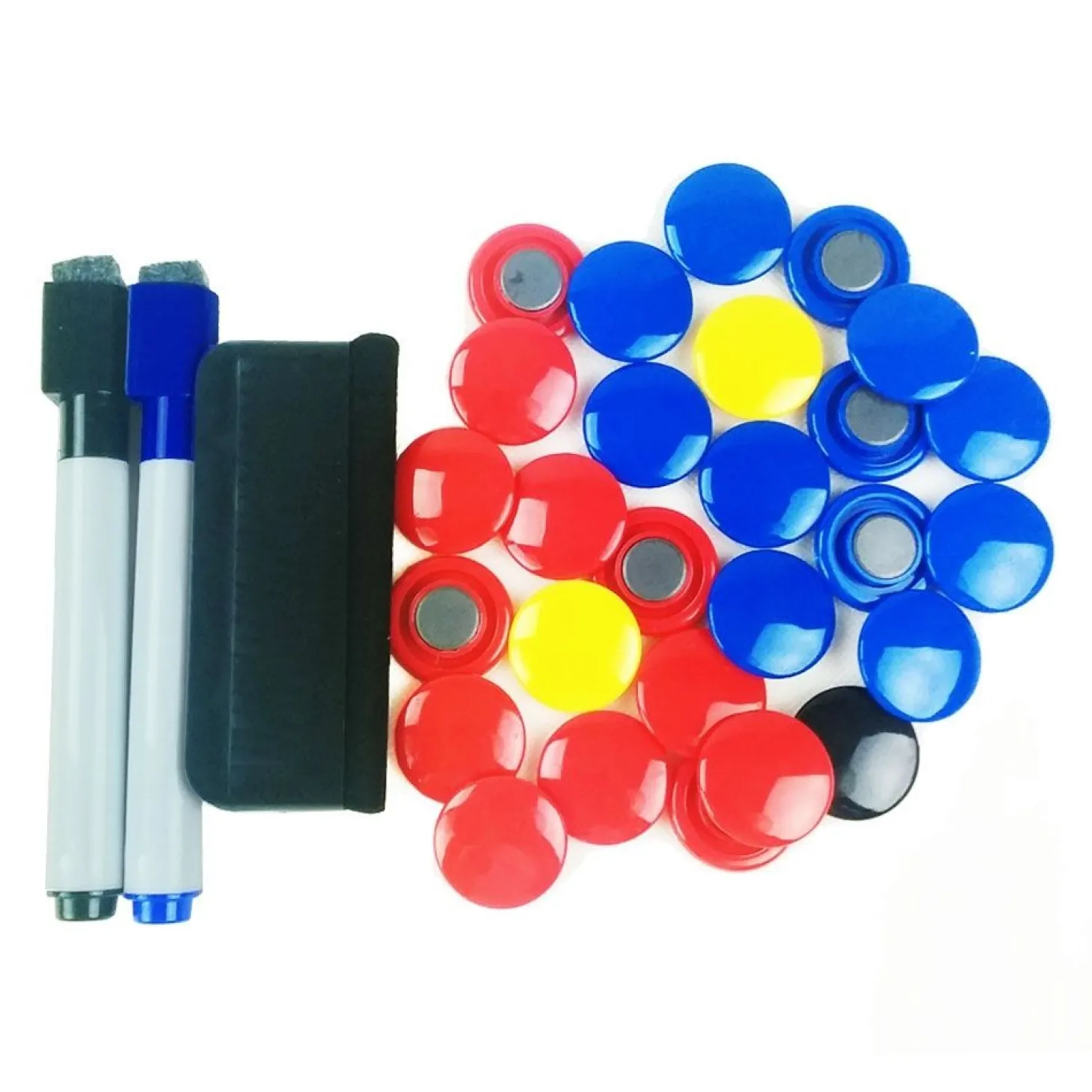 Accesorios: 2 juegos fichas azul y rojo + 2 fichas amarillas + 1 ficha negra + 2 rotuladores + 1 borrador. Todo imantado