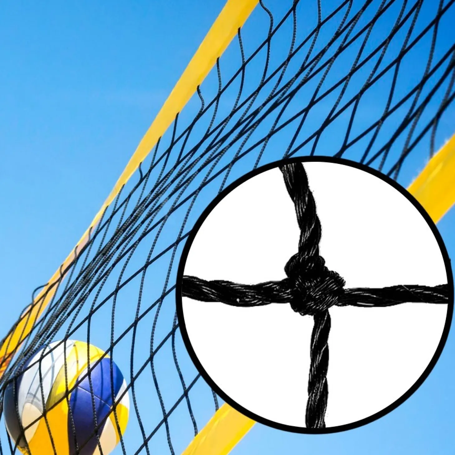 Red de vóley playa PRO especial para COMPETICIÓN fabricada en polipropileno de 3 mm, con cinta amarilla de 5 cm en todo el contorno y cable tensor de acero plastificado. Dimensiones: 9.00 x 1.00 m