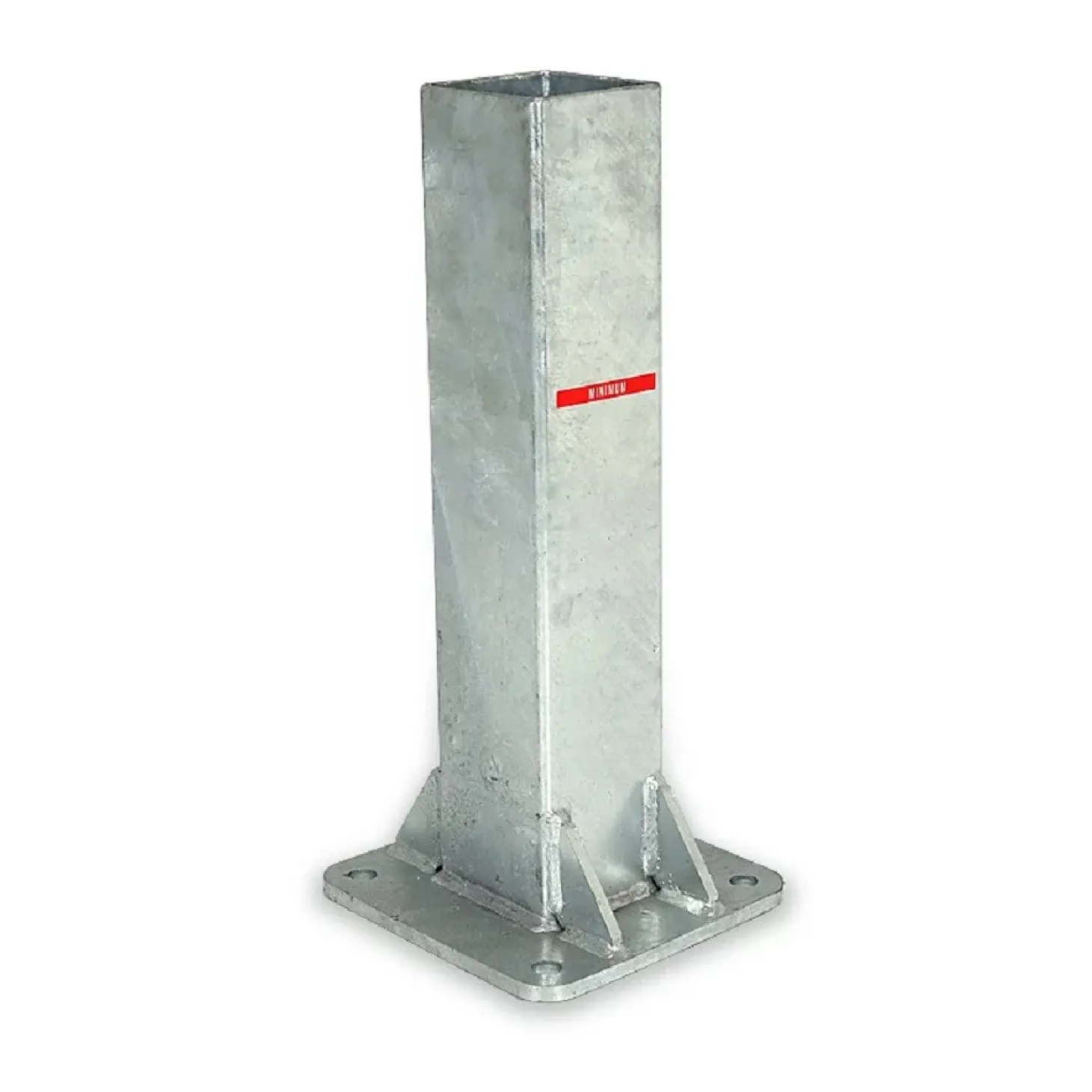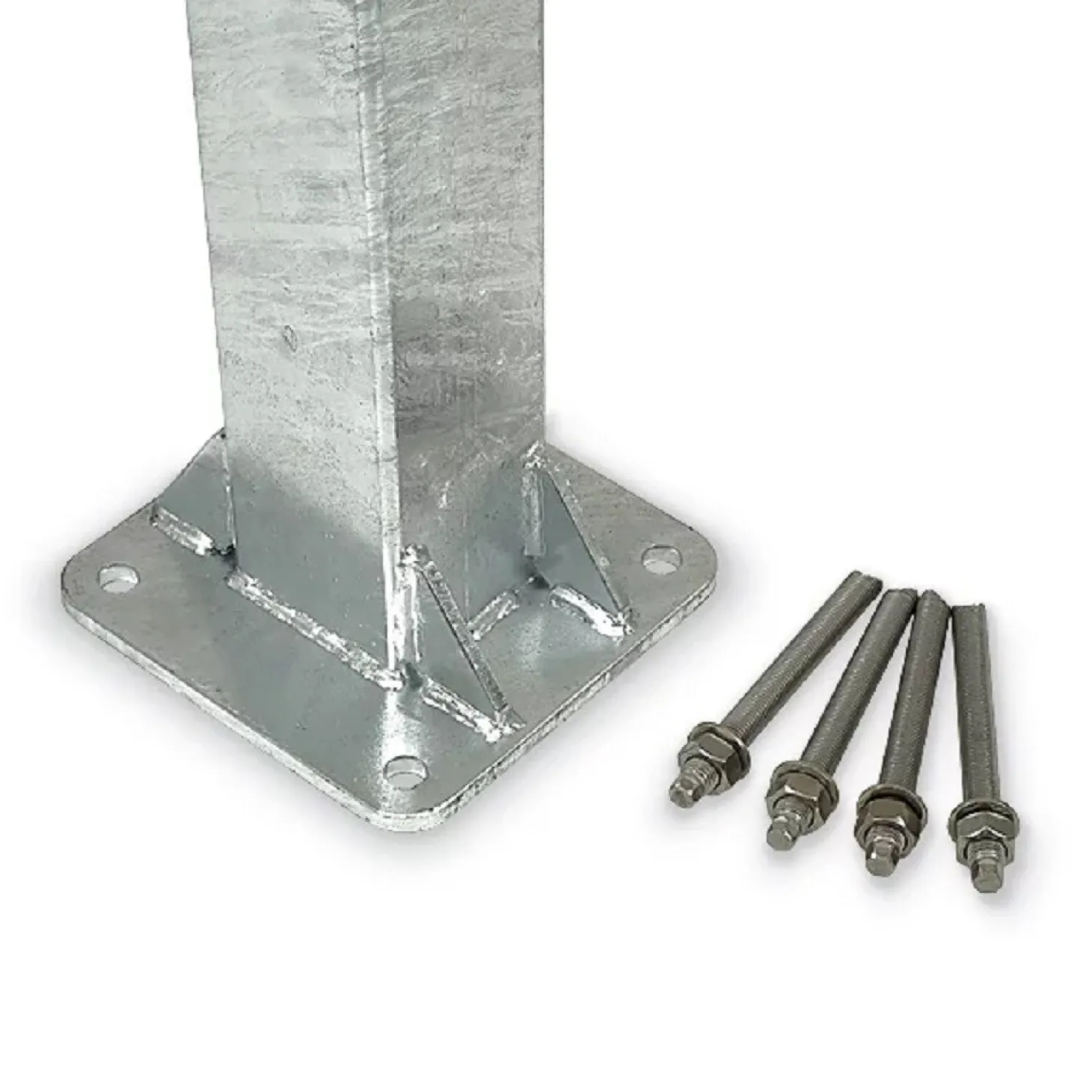 - 8 anclajes y casquillos extrafuertes para atornillar a las bases de los postes, fabricados en acero inoxidable VA4 con rosca M16.