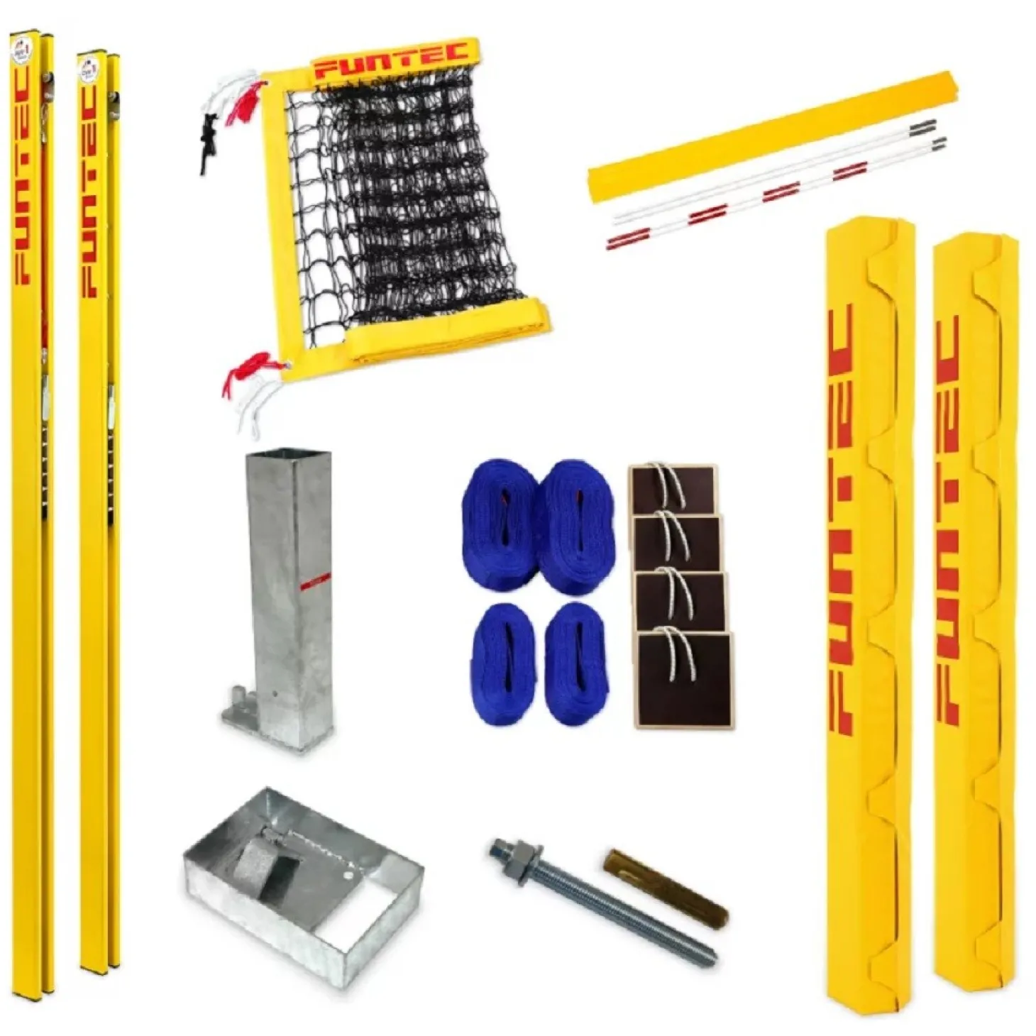 El set de vóley playa Beach Champ SBD de Funtec, marca líder en deportes de playa, incorpora todos los elementos imprescindibles para configurar un sistema de juego semipermanente. Este conjunto incluye anclajes en la base que permiten enterrarlos en la arena con dados de cimentación, proporcionando estabilidad y durabilidad para disfrutar del juego sin preocupaciones.