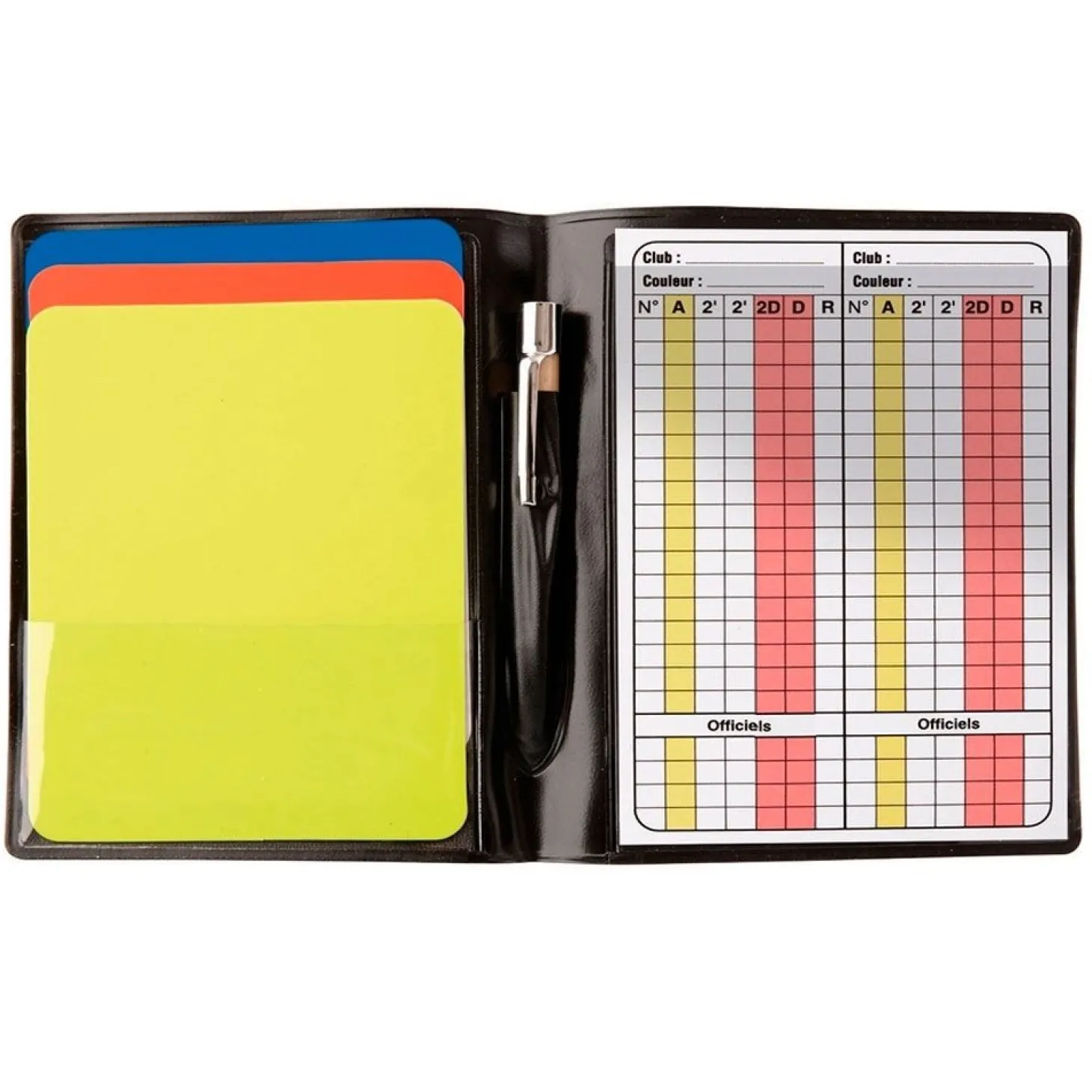 Tarjetero indicado para árbitro de balonmano que incluye tres tarjetas (amarilla, roja y azul), un lápiz y una plantilla para realizar anotaciones de registro de los partidos.