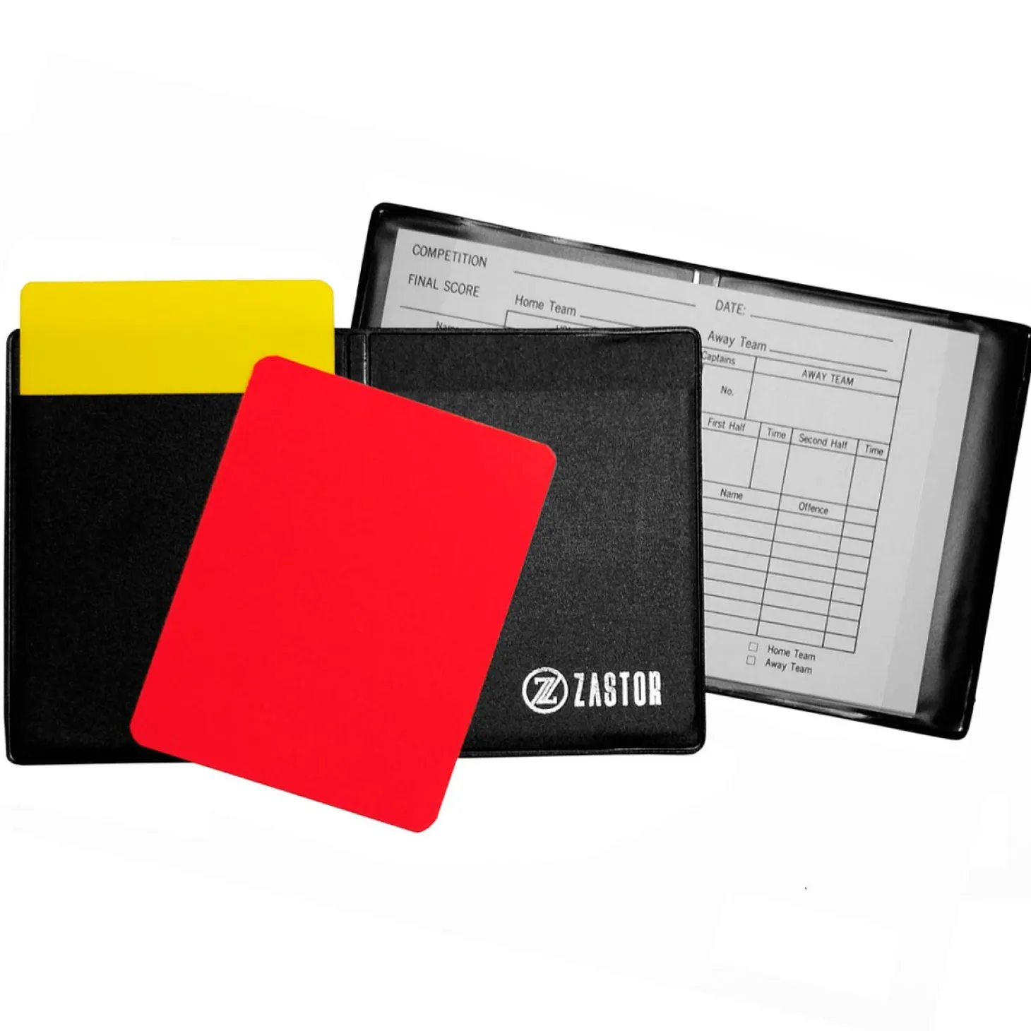 El tarjetero árbitro de color negro, incluye dos tarjetas, una amarilla y una roja y cuaderno para anotaciones oficiales de los partidos.