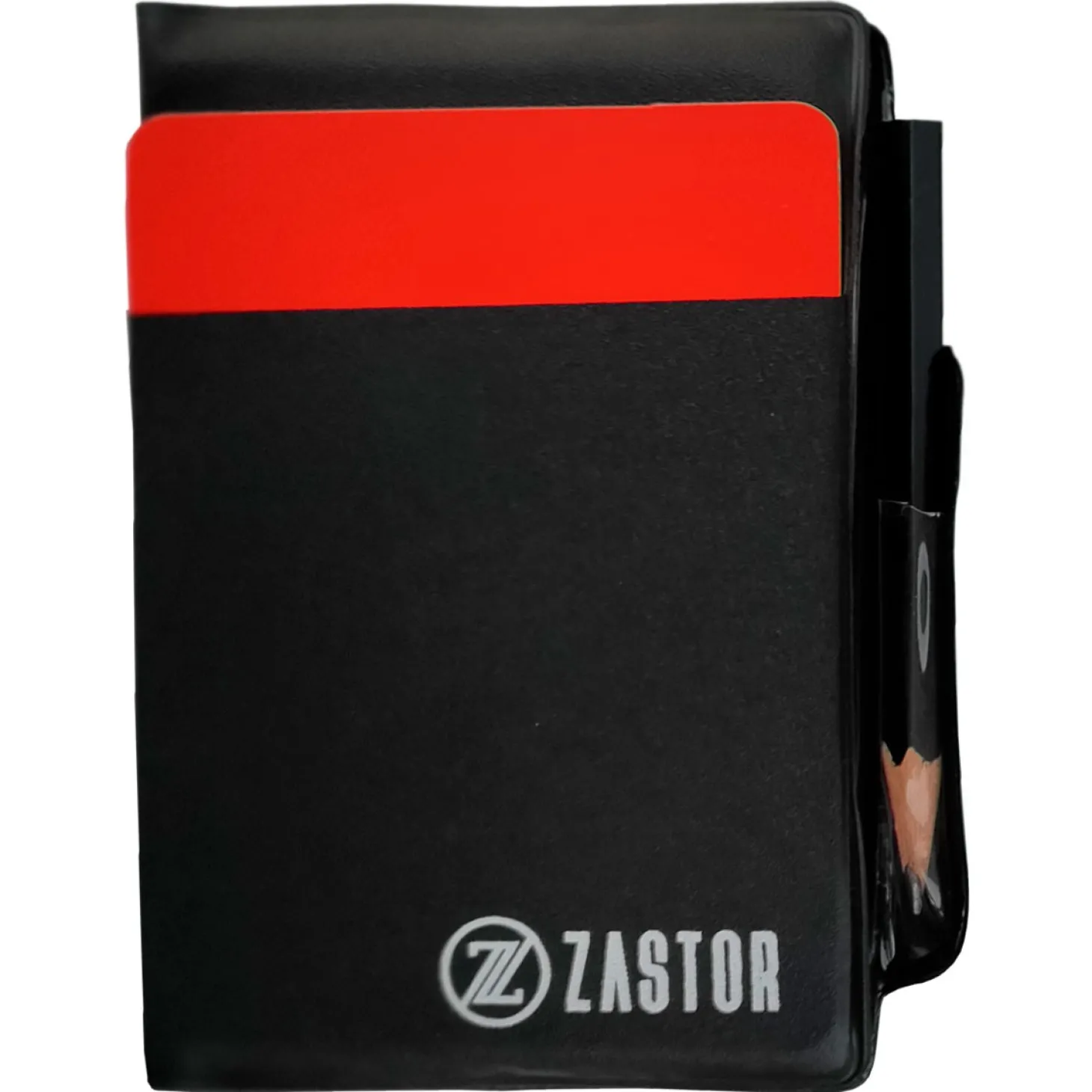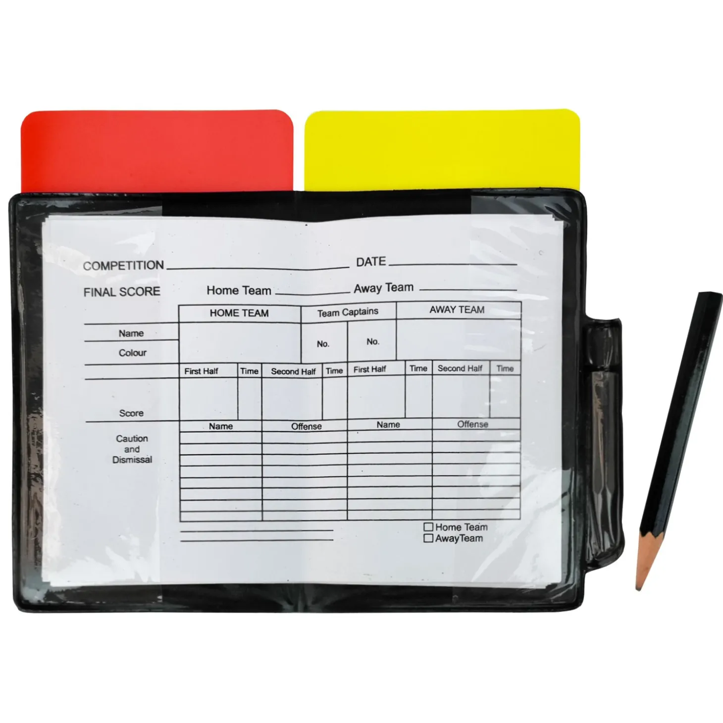 Tarjetero de árbitro que incluye tarjetas amarilla y roja así como lápiz y hojas de anotaciones para los partidos.